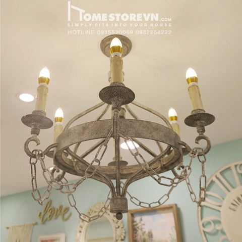 Đèn hoàn thiện khung sắt tròn, sơn giả cổ Có chi tiết trang trí xích sắt sơn giả cổ Số lượng bóng: 6 chiếc